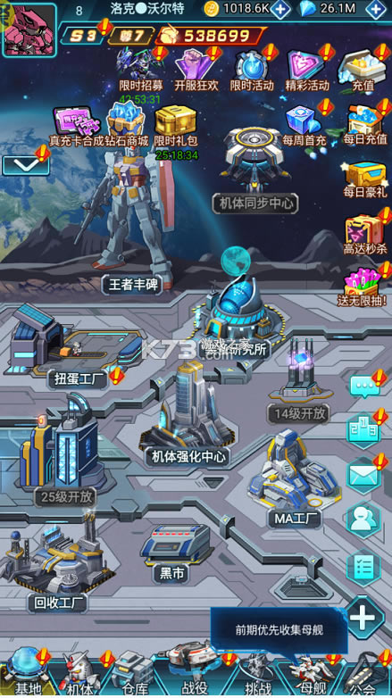 新手礼包:1元GM余额卡*100、金币*99999、机体经验*99999