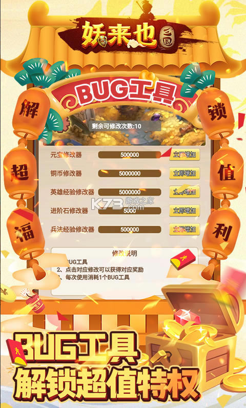 ★后缀说明:《妖来也(BUG修改器刷充)》是一款三国卡牌类手游,游戏内置bug修改器,可随意修改游戏内各种货币道具基础数值,为您的征程路上助一臂之力,成就一代三国霸主。更有bug刷充工具,可免费破解各类超值特权,科技改变命运,快来与各路豪杰一起打天下吧!