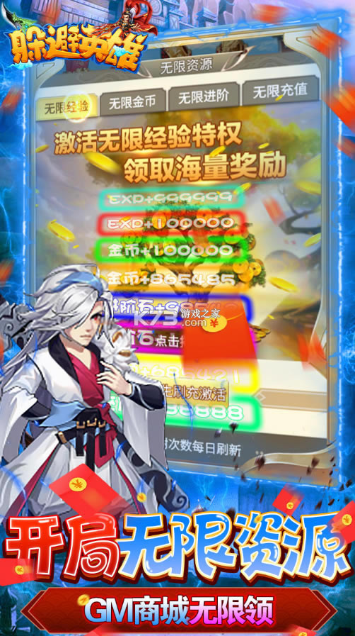 《躲避英雄》是一款三国挂机卡牌游戏,GM刷充现金券!刷满红神将! 全新版本福利来袭:开局赠送GM1特权,免费送万充现金劵!游戏内更有大量【现金券】等着玩家使用,可完全代替RMB进行礼包的购买和充值,登录送千百张高级纳贤令;天天签到送武将;打造前所未有的战斗回合体验,人气大作轻松上手,战马飞驰、三国名将,让你体验全新刺激的三国之旅!
