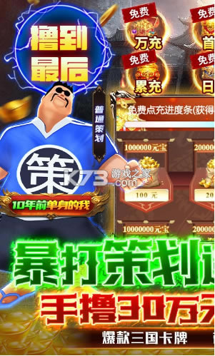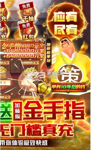 4、充值比例高达1:10000,每档首充三倍返!开局即送策划金手指,限时神权GM,千万元宝!千万铜钱!VIP10,VIP礼包免费领!上线即享受土豪般的快感。