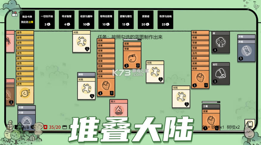 将卡牌堆叠在一起可以获得不同的物品,例如将村民放在树上可以获得木头等等!
