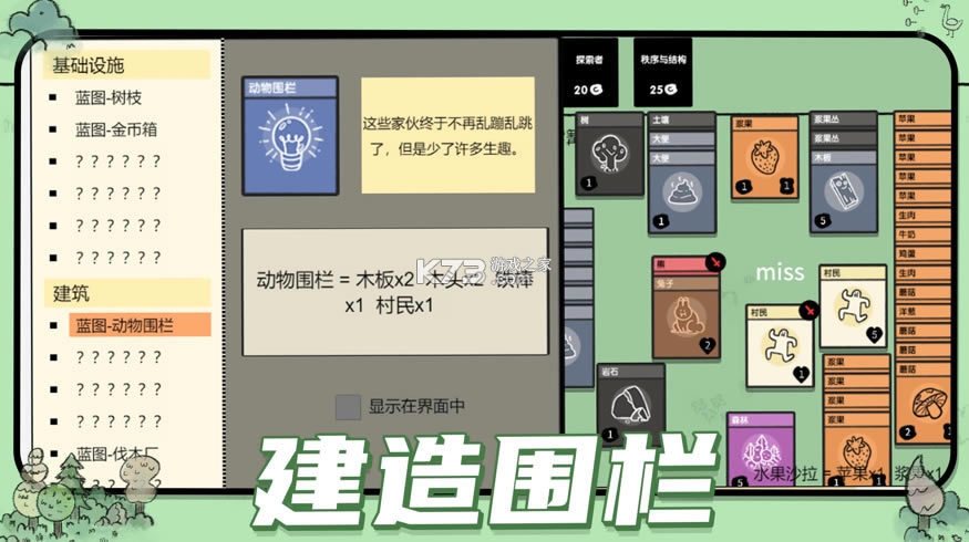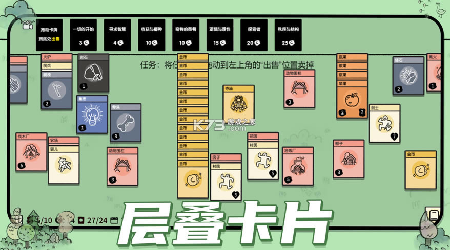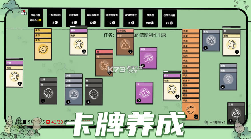 开局选择村民来建造村庄,你可以通过堆叠卡片来收集食物,建造结构,并与生物战斗。