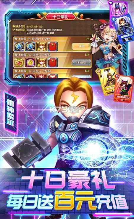★上线超值福利!登陆就送金币888W、VIP贵族5,“十日豪礼”领取礼包,其中包括100元充值卡,使用后包括100000钻石。并激活线上活动,使用100元充值卡可激活“千充千抽”活动,玩家可以领取道具,其中包括十连抽英雄券,让玩家更加自由的搭配多种英雄,钻石英雄全都送!