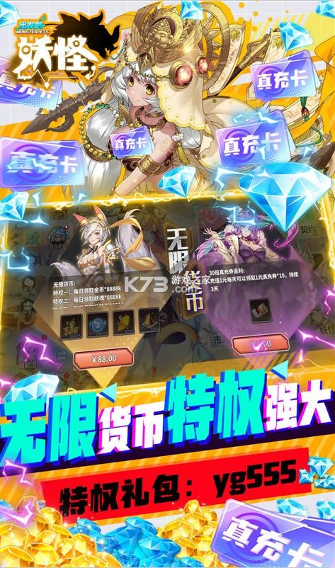 ★创角送VIP,五星妖怪、1888元真充券、88888钻石、8888k金币