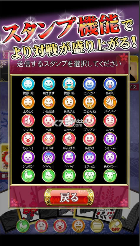 可以有多种模式对战,联网,暗语,以及和朋友都能一起玩这款在日本非常火爆的花牌游戏,可比一般的扑克牌有意思多了哦,在游戏的过程中还可以和你的小伙伴聊天,可以向对手发送各种表情,还可以选择配对来选择对战的对象,自由度很高。