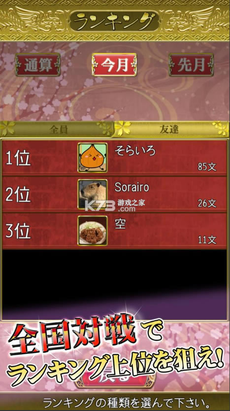 随机与全国的玩家对战。在koikoi中获胜获得点(文)与其他玩家竞争排名。朋友申请后可以进行无数次对战,相反,如果对手强大的话可以拉黑他。