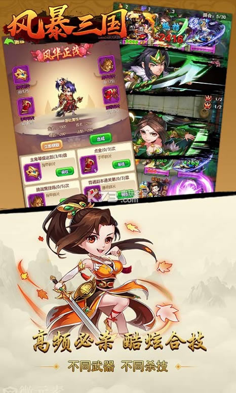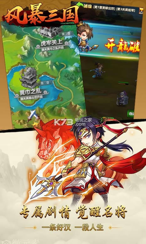 《风暴三国》是一款角色扮演的卡牌游戏,在游戏中,您将扮演三国一众名将的主公,在您的带领下,您将驰骋于神州大地,破黄巾、定黑山、收貂蝉、拥尚香。一切尽在您的掌握中,您的智慧和勇武将带领您走上巅峰。