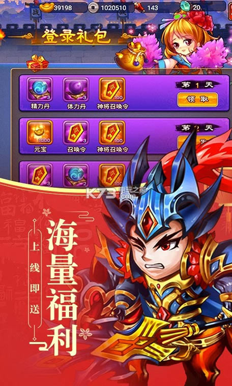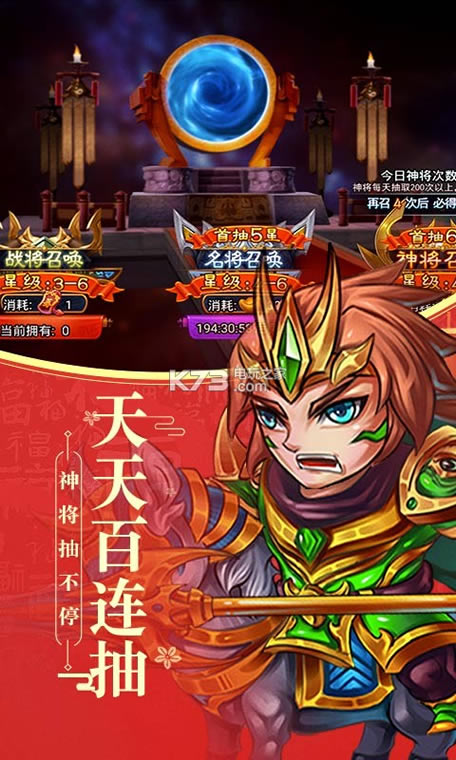 ★每日登陆礼包送100神将召唤令,每日百连抽,200抽必出神将!