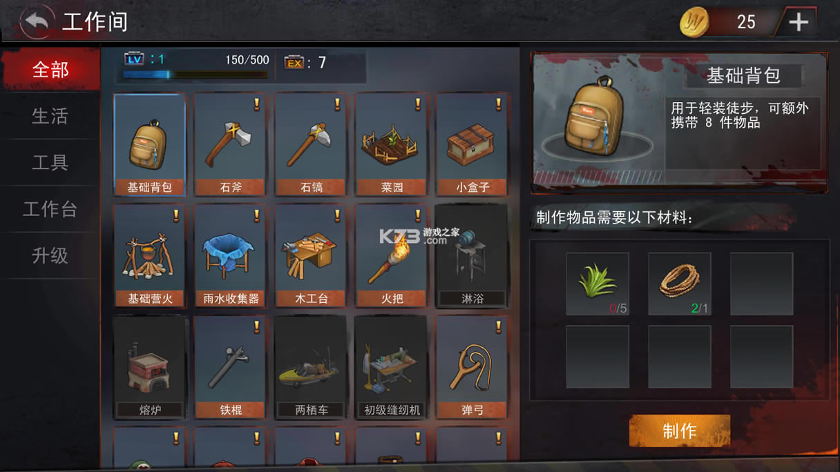 多多搜集野外的地点,好好利用手里的武器或者是工具,它们是你唯一能够阻止僵尸对你的进攻。