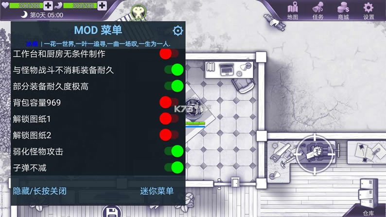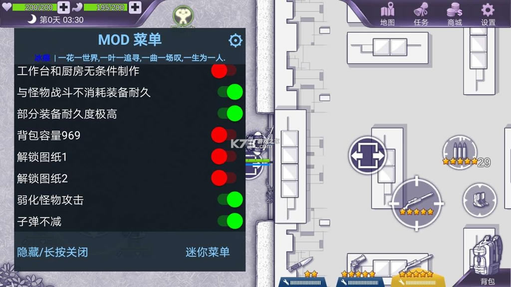 破解内容:内置作弊菜单: 1.饥饿值不减 2.受到伤害为0 3.工作台和厨房无条件制作 4.与怪物战斗不消耗装备耐久 5.部分装备耐久度极高 6.背包容量969 7.解锁图纸1 8.解锁图纸2 9.弱化怪物攻击 10.子弹不减 注意:需要开启悬浮窗权限,闪退的话重新进入游戏即可   1.0.21最新破解版地址 http://m.k73.com/down/android/593297.html