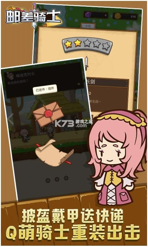 该游戏Q系萌版的简约画风,条理清晰的有趣玩法,会从中带给玩家别样的精彩体验。在这里您将扮演一名邮差骑士,通过往来于各个王国之间,进行运送信件和邮件的工作,但在送往中你会遭遇各种艰难险阻,并且伴随着的还有强大的怪物出现,利用与其的战斗精彩瞬间来提升骑士的实力,使其成为一名强大的存在。邮差骑士的战斗模式,采用了半挂机形式,因此简化的操作将大大降低玩家们的操作难度,轻轻的只需单指释放技能便能快速完成冒险,伴随着RPG游戏的骑士养成,玩家可经由不同模式的历练来提升自身实力,而现在就开始你的邮差骑士成长之路吧。