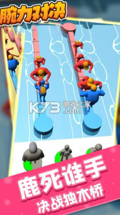 腕力对决是一款魔性搞笑的动作格斗类型的游戏。在这里,玩家将展开趣味的格斗竞技。解锁各色皮肤,和对手进行独木桥竞技,发挥自己的腕力,将所有的对手全都打下桥去。