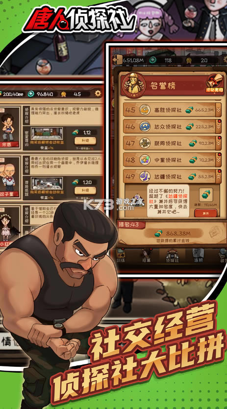《唐人侦探社》是一款侦探解迷游戏,升级侦探社招募顶级侦探来帮忙开拓业务,成为传说中的“头号侦探社”。训练玩法锻炼眼力,逻辑推理助你破案,每个人都可以成为“推理大师”。