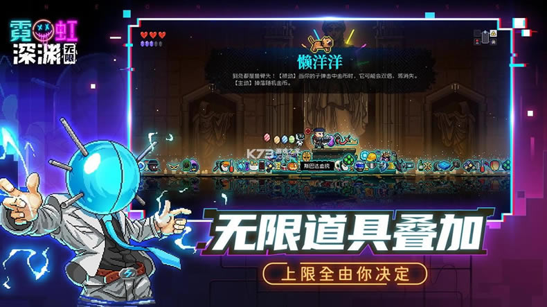 是一款注重道具叠加效果的横版动作地牢游戏,你可以根据喜好自由选择地牢的进化路线。身为神秘组织的一员,你将在霓虹闪烁的地下世界中探险,收集千奇百怪的道具,击败恶魔与众神,寻找地牢最深处的宝藏。
