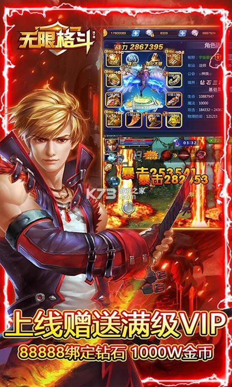 《无限格斗》送1000元充值,快乐过神仙!上线赠送VIP12(满级VIP)、88888绑定钻石、1000W金币、500体力,开始拳拳到肉的格斗模式!