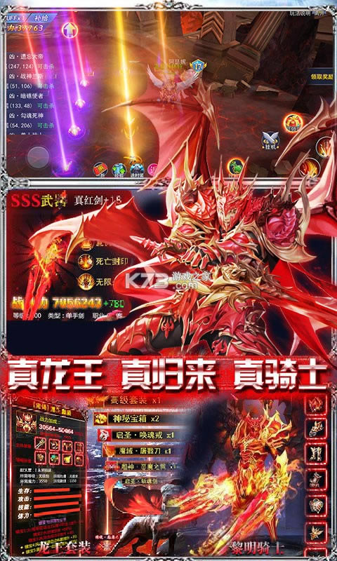 多种创新模式助成长;公会争霸跨服PK,千人同屏开启旷世混战;快乐交友女神助阵,好友结婚再续前缘。王者无畏,魔神无惧!在刀剑相对,战骑嘶鸣中感受这无尽热血中的爆丽美学吧,为了爱与真实的信仰,开启英雄之路!