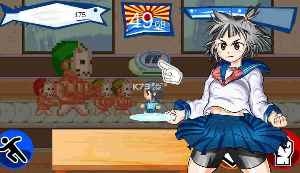 《心跳不已格斗回转寿司(ドキドキ格闘回転寿司)》操作可爱的高中生来快速的吃掉更多的寿司,通过最简单华丽的大招来让对手打倒,打倒后也会有新的寿司加入,快速的来这里提升数值,强化技能。