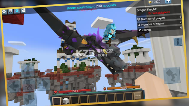 这是一个PVP游戏,一共有8个队伍,每队有2个玩家,存活到最后的玩家获得胜利。玩家通过打破不同颜色的幸运方块来获得不同的武器、防具、道具,灵活使用获得的物品来击杀更多的敌人,在游戏后期打败敌人最多的玩家会变身为龙骑士,可以骑乘飞龙让自己变得非常强大!