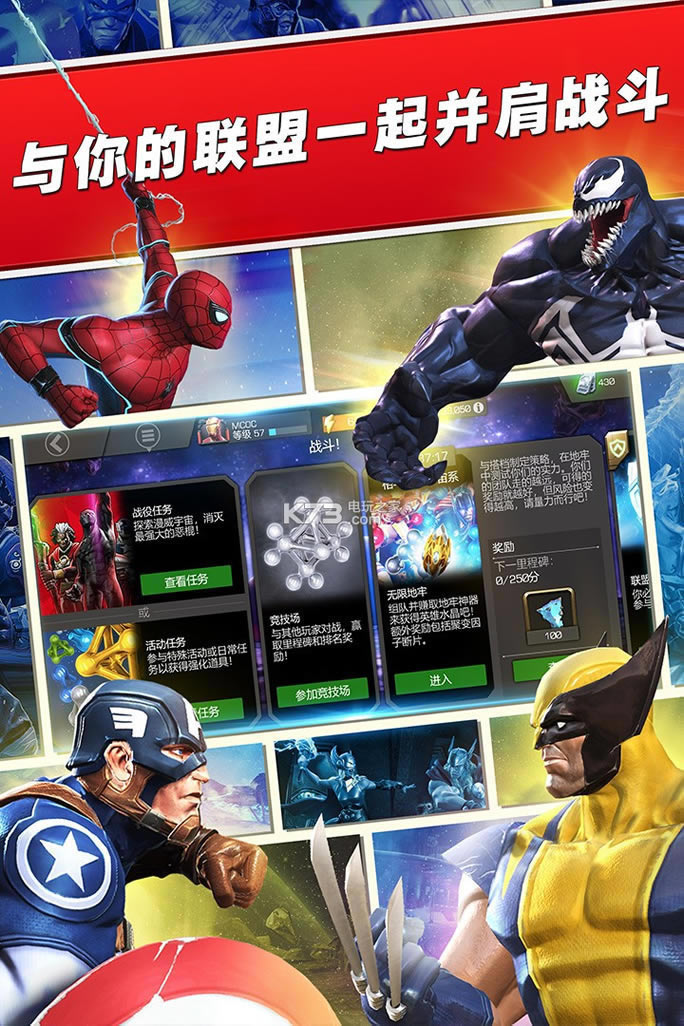 • 用英雄和反派角色来打造一支战无不胜的队伍(可选角色包括: 钢铁侠,浩克,金刚狼,风暴女,星爵,卡魔拉,蜘蛛侠,死侍,万磁王和冬兵等)