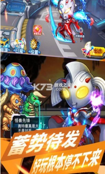 奥特之王,终极装备,扫荡怪兽,疯狂收割,战斗领袖,超级BOSS,各种各样的小怪物等你去战斗,用智慧和战术去击败。