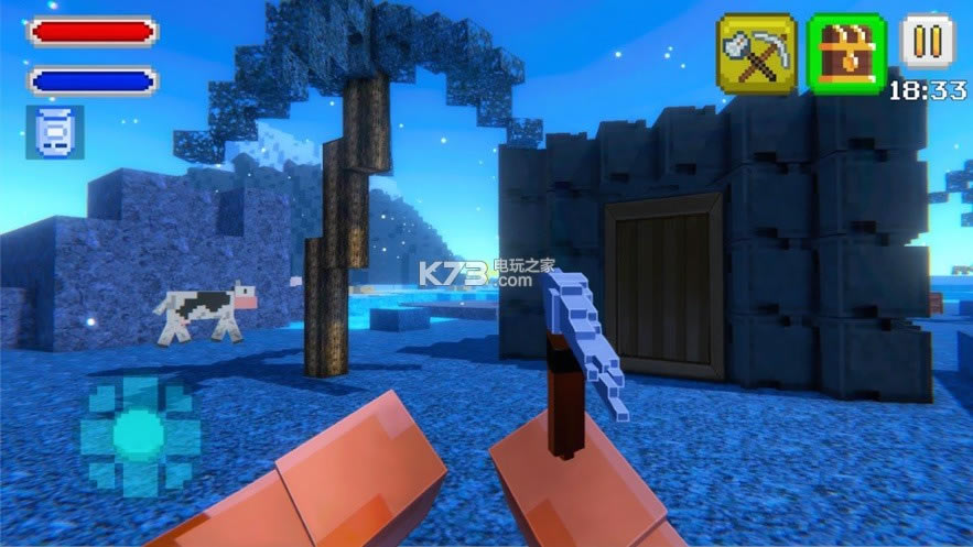 探索广阔的冬季岛屿。用石块和木头给自己盖一间小屋。小心雪地生物群落中危险的野生动物。
