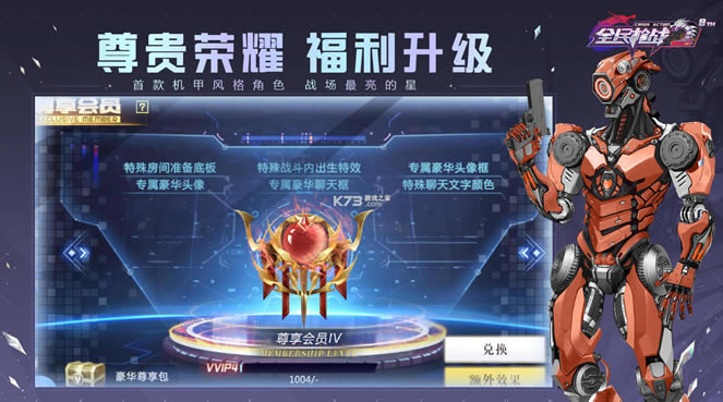 4、尊贵荣耀,福利升级。全新机甲风格角色。年度VVIP尊享活动,解锁相应会员等级,获赠房间特殊准备底板、特殊战斗内出生特效、专属豪华头像框、专属豪华头像、专属豪华聊天框、特殊聊天文字颜色、专属机甲角色、武器等尊享专属礼。