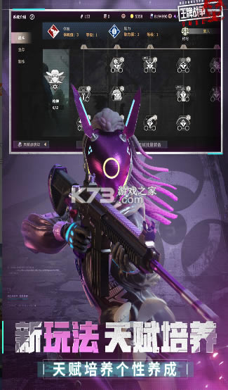 二、每个人独一无二---天赋2.0 新版本天赋更改为天赋书的形态,每个玩家可以自由选择天赋点如何加点。即使是同个类型的天赋,生还者也可以通过自由搭配形成不同玩法,极大提高战局玩法的丰富度! 比如,善用近距离攻击的“暗杀-觉醒”、适合老六狙击的“精确瞄准”,又或者适合火力压制的“扫射”。即使是同属攻击类型的天赋,也可以有不同搭配!医学天赋、枪神天赋、采集天赋、制造天赋,多种天赋、多种搭配路线供你选择!