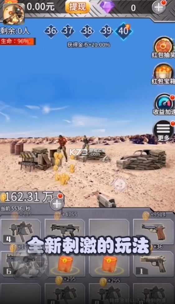 射击闯关类游戏,简单的放置玩法,玩家需要购买各种枪支,进行合成以此来获得报酬,击败大量的敌人。