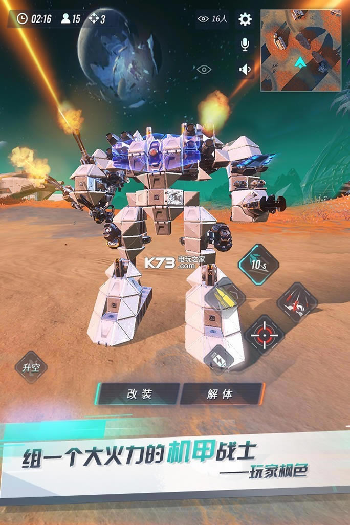 在《重装上阵》 ,你是让人敬仰的太空工程师。用你天马行空的创造力,组装出独一无二的战斗机甲!驶过环形山口,飞越宇宙星空,和全世界玩家联机比赛,开启精彩绝伦的太空冒险!