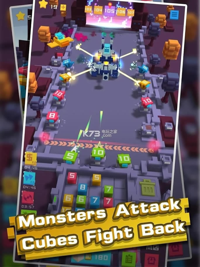 2、建立防御塔楼,合并立方体以增加塔楼的伤害,并击败外太空邪恶的无尽浪潮;