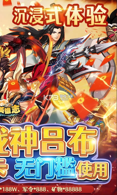 《三国英雄志-送吕布万充》是一款三国题材经典卡牌手游,集合三国各大名将,高还原度场景,让你身临其境感受真三国动作卡牌。各种技能组合、大招秒杀,体验前所未有打击快感;各个阵营武将培养有不同玩法,多种日常竞技挑战等。上线送海量福利V10特权,首日可令三国战神吕布助你通关刷本无压力,游戏内0氪万元充值,通关再送充值卡,体验土豪的快乐,赶紧来做一回三国最强君主吧!
