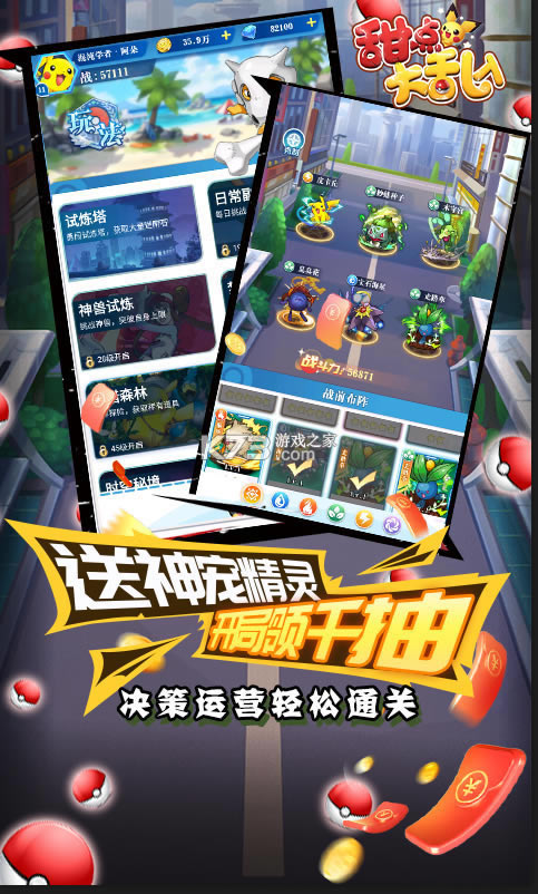 精灵分为不同的属性,可以组成不同的羁绊阵容,不同的阵容可以延伸出无限的玩法!游戏中还有试练塔,公会系统可以让玩家在游戏中体验无限的乐趣,获得五星精灵,组建不一样的队伍,冒险之旅中尽情享受战斗时刻!可爱Q萌的画风让人欲罢不能,畅玩童年回忆,你还在等什么,快来与皮卡丘一起踏上成长之路,享受悠闲时刻!