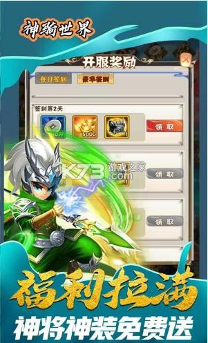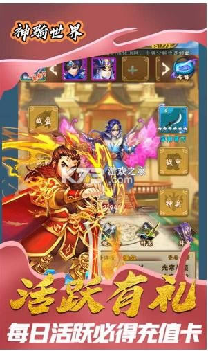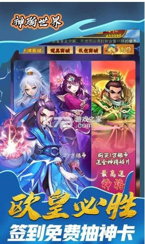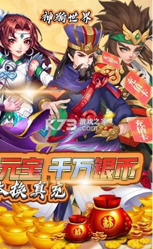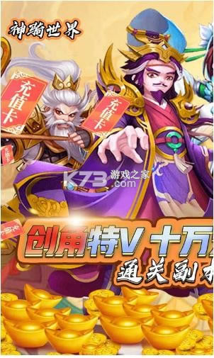 《神骑世界》创角送特v,10w元宝和超多银币福利超多,通关福利就送真充,神将神装上线免费送,免费抽神将活跃有礼,以三国为基础的游戏,卡牌组合排兵布阵考验玩家们的智慧,剧情闯关副本畅玩,进入三国世界挑战。