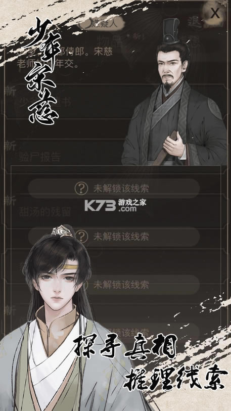 少年宋慈是一款古风画质推理解谜手游,作为知名的古代宋慈,玩家们将仔细搜索各类案件中的线索,大胆猜想,追寻最后的真相,以真理的推翻更多的无厘头的案件,感兴趣的玩家赶紧来下载少年宋慈试试吧。