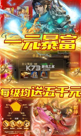 6、每级都送5000元宝,超多粮草铜钱随意送,升级节奏更是提高50%,全程顺畅闯关,一直领钱一直爽!