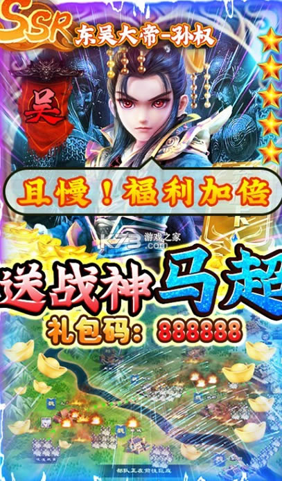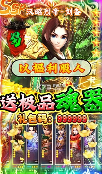 ★上线即送三重好礼,“绝色貂蝉”礼包码:666666,“战神马超”礼包码:888888,“极品魂器”礼包码:999999