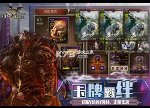 《万魂觉醒》是使用了百余张高品质写实风格美术的卡牌对战角色扮演类游戏。 卡牌共分为人类,怪兽,妖精,条顿,天使,龙,恶魔七个种族与支援,防御,万能,攻击,策略类型的五个职业。通过种族,职业的组合,可搭配出无限种牌组,使用依照自己策略搭配出的牌组与其他玩家对战,从中获得成就感与乐趣。