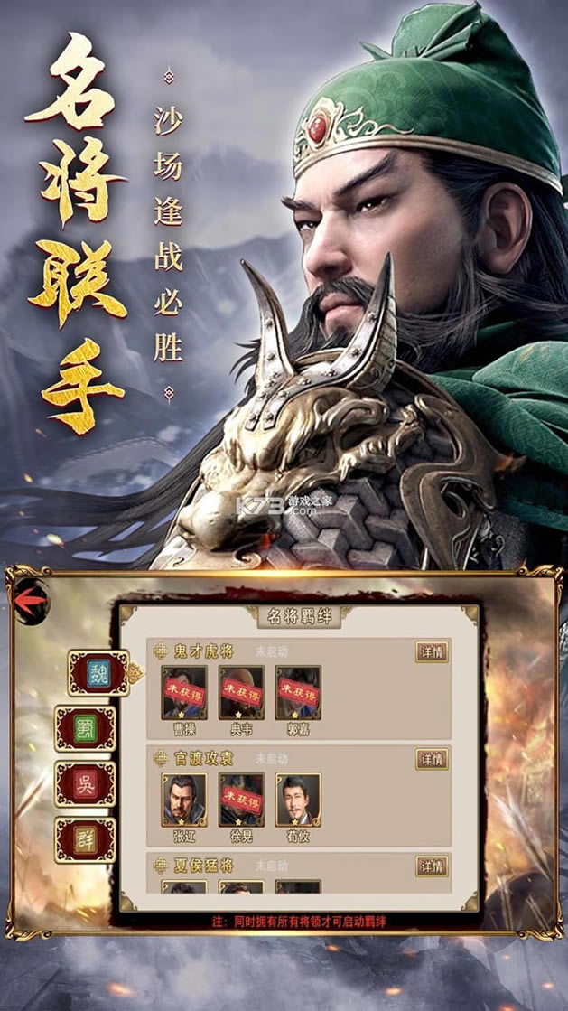 特色技能策略百变,周瑜配诸葛,关羽配曹操,打造心目中完美的英雄阵容。玩家选择加入魏蜀吴其中一个阵营,身负朝野海内之望,胸怀治世经纶之志,种田养民还是率史诗名将同天下诸侯共谋天下之主。全在一念之间。