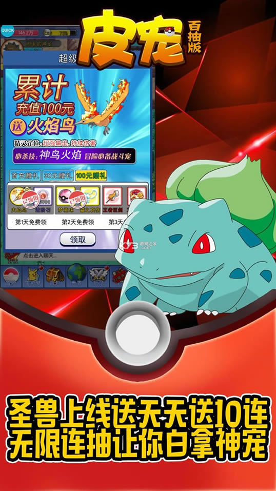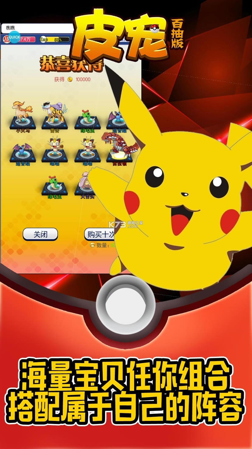 《皮宠百抽版》这里有很多的宠物,玩家在这里可以收集这些宠物一起开始冒险,在奇幻大陆上战斗,参与各种竞技战斗,大量的游戏福利活动全部上线,玩家上线就可以领取钻石和金币,不用氪金也可以轻松游戏.