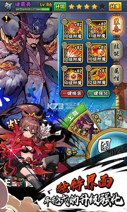 在游戏中,玩家可以通过任务、副本、活动获取强力的装备、道具,提升战斗力,并且收集各类“神将”,不同的搭配能给玩家带来策略动作游戏的无限乐趣!更有国战,跨服战,掠夺战大型PVP玩法。为国而战,刻不容缓!