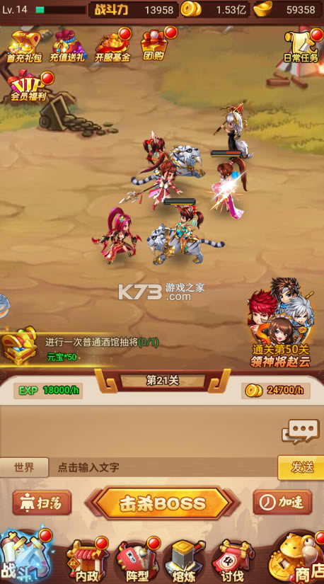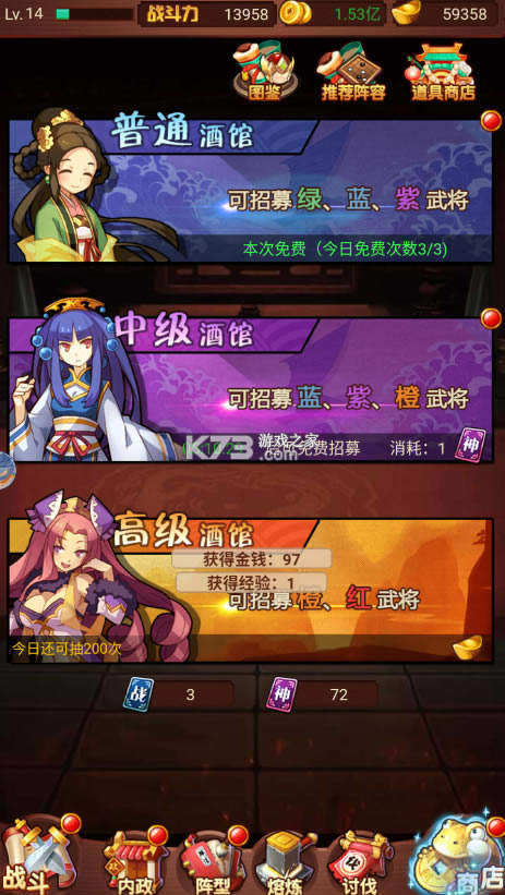 1、海量的武将,自由的招募,属性的不同功能也不同