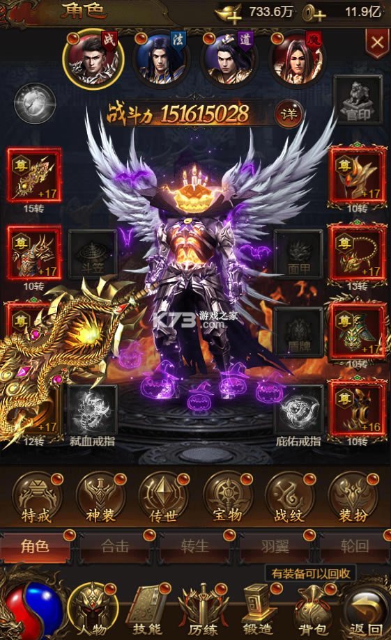 9、大量可供收集的神装和翅膀,玩家可以通过冒险和挑战来获取相应的装备,华丽的羽翼也能带给你巨大的战力增幅。