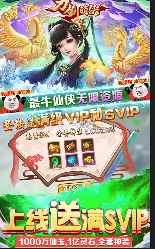 ★【版本福利】:上线送满VIP、1000万仙玉、一亿灵石、10亿铜钱,炼气全套神装;在线送GM1、5000元实充和月卡!签到每月送9000元实充、3000神玉;活跃享受巨额实充,白拿爽到飞起!