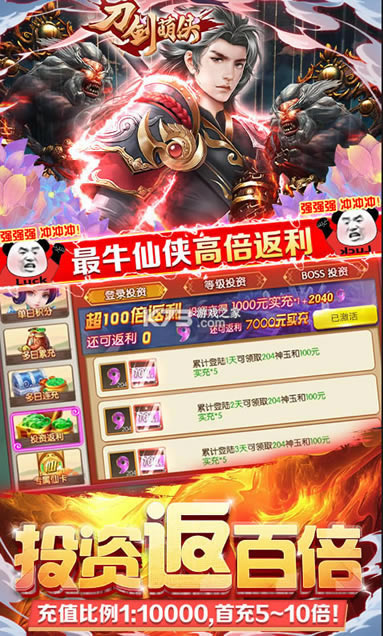 ★【充值高返】:首充5~10倍返还;投资计划分别可获得超100倍、超150倍、超200倍的收益,收益包含有实充、仙玉、神玉;更有神玉投资,领取高达16倍神玉!