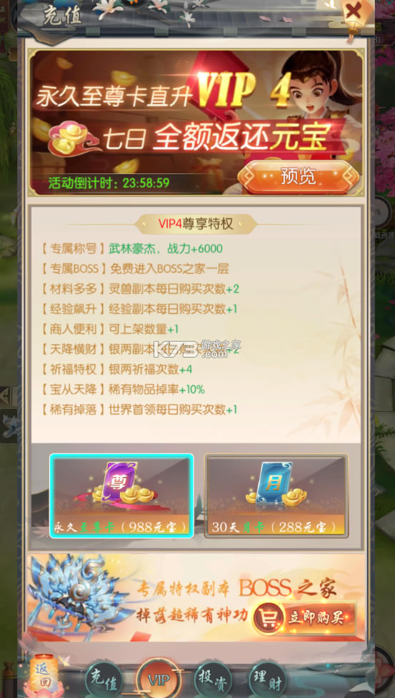 《热血神剑》在线快速的提升战力,成功来挑战山贼,完成等级开启全新的玩法,在这里永久至尊卡需要988元宝,30天的月卡需要288元宝,专属的游戏特权,掉落超稀有的神功,拥有8.8倍的返利。