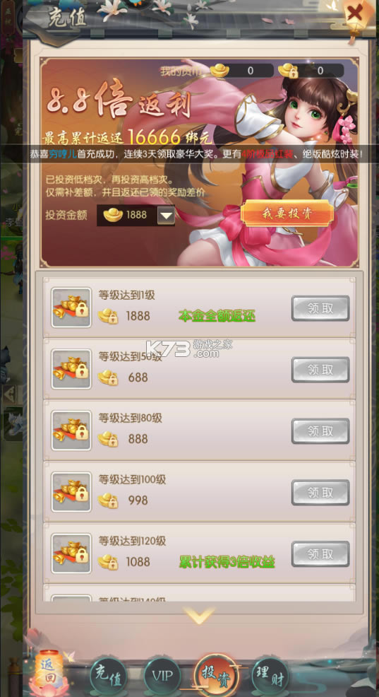 等级达到1级则可全额度返1888,等级达到50级688元宝,等级到达80级返还888元宝,等级到达100级返还998元宝,等级到达120级返还1288元宝......