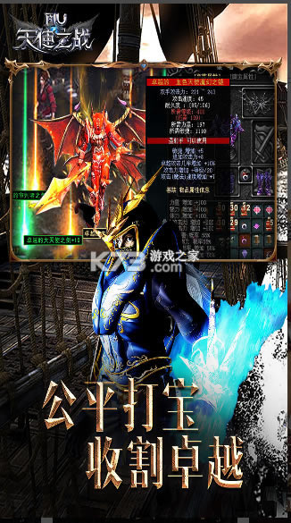 《天使之战》是一款奇迹类角色扮演手游,游戏整体画面高度还原奇迹MU端游。经典三职业战士、法师、弓手燃情回归,多样加点及培养塑造三职业不同的成长!所有地图场景百分百还原端游,全地图野外自由探索,打宝BOSS获得稀有装备。