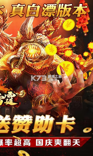《怒战雷霆》是一款专为庆祝国庆假期的单职业超变传奇手游,上线送万能充值卡免费激活赞助、每天送充值,打怪爆货币。超高爆率,刀刀光柱,散人称王,国庆最爽版本!
