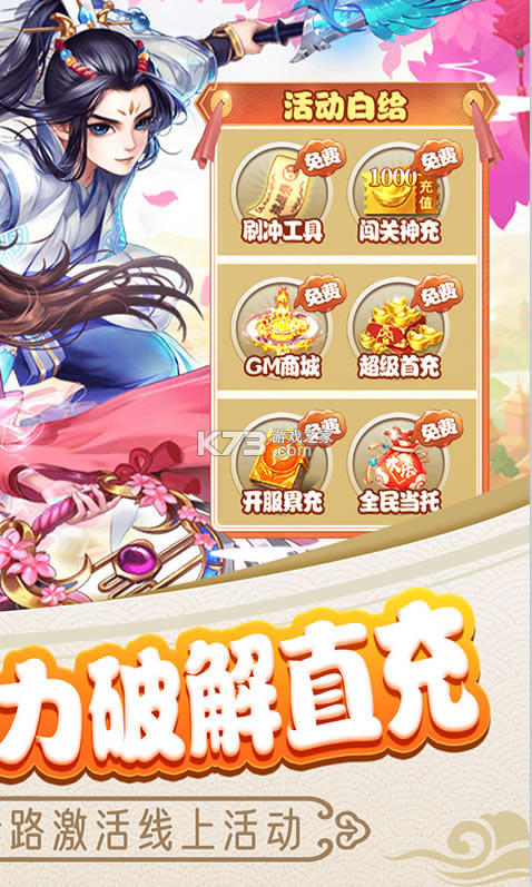 《魔剑奇兵(GM破解刷充)》是一款真正的白嫖党福利仙侠放置手游,上线即赠送豪华VIP30,点充神器破解直充,登陆即送充值卡,更有真网管资源 ,无套路激活线上活动,真正做到不花钱也能成大佬!
