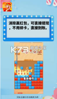 将红包的元素加入在游戏中,玩家们可以去享受指尖的消除乐趣,游戏中增加了道具的使用,在合理的时候去进行使用,可以做到轻松消除,对于玩家的手速也是极大的挑战,快去挑战你的最好成绩吧